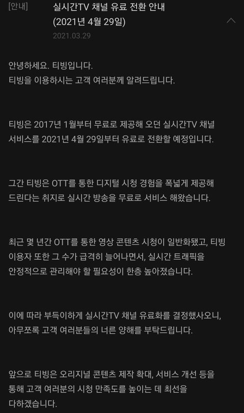 티빙 실시간 유료화