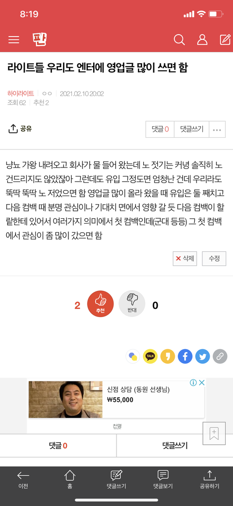 얼마전 영업글 올린 쓰니인데 그 글 올리고 나서도 사실 독려가 별로 안 됐었거든... 근데 그러고 나서도 영업글 써서 댓글 달아 달라고 글 올리니가 그 다음엔 라이트들 너도 나도 영업글 썼다고 올리고 엔터글에 댓글 달자고 올리더라고