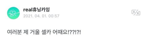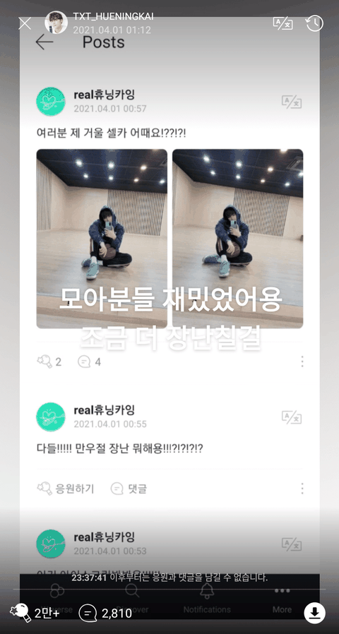 알고보니 부계정 리얼휴닝카잉으로 몰래 거울셀카 올려놓고 팬들 반응 구경하고 있었던거ㅋㅋㅋ 찐 휴닝카이 계정으로 댓글도 달아줌ㅋㅋ그런데 알고보니 부계정 게시글이 그전에도 올라와 있었음ㅋ