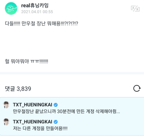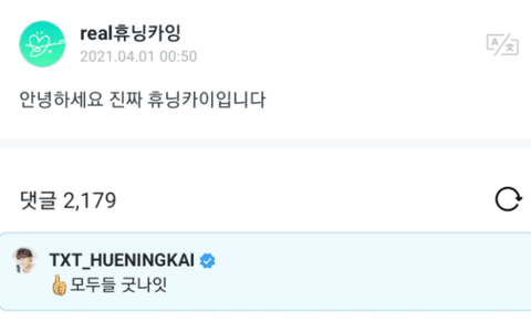 만우절이 되자 위버스에 글을 올린 투모로우바이투게더 휴닝카이