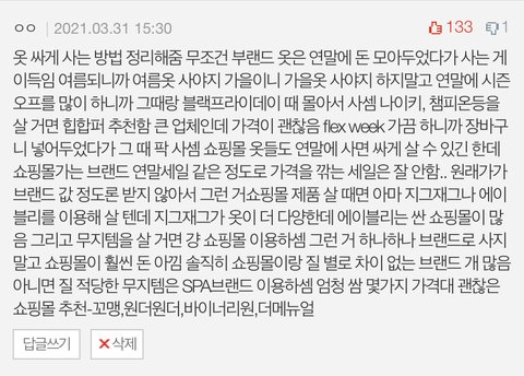 3. 내가 쓴 댓글의 답글 중 에이블리 질 낮은 상품이 많다는 얘기가 있었는데 틀린 말은 아니지만 결국 입점된 쇼핑몰의 문제인지라 후기를 잘 고려해서 보면 실패확률이 별로 없어 쇼핑증독자라 지그재그나 에이블리에서 엄청 많이 사봤는데 후기가 거의 없던 옷 1~2벌 제외하곤 실패한 적 없었어 댓에 써 있듯 불안하면 SPA브랜드 이용하면 되고 갠적으로 무지템 무신사 스탠다드 질이랑 가격 다 괜찮았어 이것도 블프때나 연말 때 사는 게 좋고 연말이나 블프때까지 기다리기 싫으면 시즌 좀 지난 후에 사면 대부분 브랜드들이 30%정돈 세일을 해 주니 그때 사