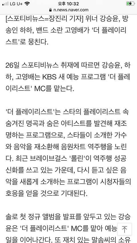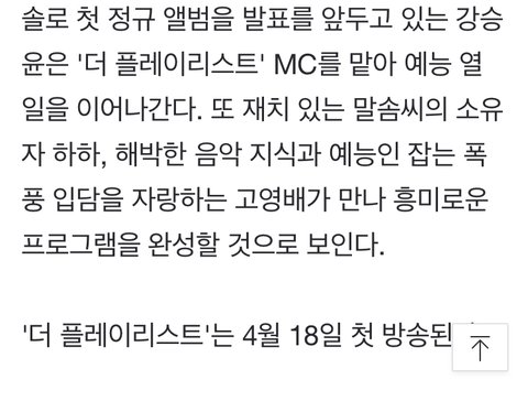 유니버스들! 18일에 KBS에서 더 플레이리스트라는 예능프로그램이 첫방송해! 그 예능 프로그램이 숨은 명곡과 숨은 아티스트를 발견해 재조명하는 프로그램인데 타곤이들이 나올 수 있을 거 같아서 글 써~ 최근 브레이브걸스 롤린이 역주행 성공 신화를 쓰고 있는 가운데, 다시 듣고 싶은 음악을 새롭게 소개하는 프로그램이 시청자들의 호응을 얻을 것으로 기대된다고 그러네. MC는 위너 강승윤, 하하, 밴드소란 고영배님이라고 나와있어! 이번에 do or not이 1위 못했는데 여기에 노래가 나와서 역주행되면 좋겠더라고. 데이지도 노래가 너무 좋고ㅠ