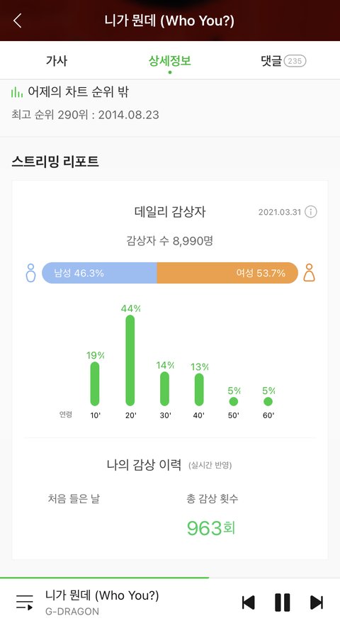 살짝 질려서 다른 노래 듣고 또 130922 보면 너무 좋아서 또 계속 듣고 이거 반복 ㅋㅋㅋㅋㅋ 권지용 특유의 노래하는 목소리(얇은 고음) 너무 좋아해서 니가 뭔데 사랑함