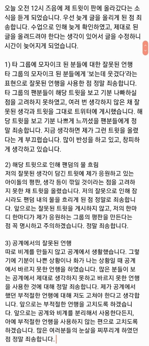 지금 트위터에서 다른 팬분들을 불쾌하게 만들 수 있는 글을 저희 중 한명이 썼다고해서 사과하려고해요