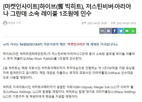 하이브(구 빅히트), 저스틴비버·아리아나 그란데 소속 레이블 1조원에 인수.txt