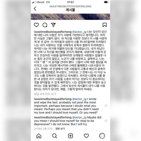 다이렉트 메시지에서 개인적으로 소통을 나눈 뒤, 저는 비록 저의 대화 상대는 삶의 어려움으로 차가워 보이긴 하지만 그는 좋은 사람이고, 그렇기 때문에 사랑과 같은 순수한 것들만이 그를 행복하게 만들 수 있다는 것을 깨달았다는 게시물을 업로드했었습니다. (남자주인공은 겉으로는 차갑고 사회로부터 고립되어 있으며, 사랑이라는 감정과 다른 사람들과 깊은 관계를 맺는 것을 피하지만, 고문영는 그에게서 "사랑에 목마른 아이"를 발견합니다.) 남자주인공은 매년 이직할 강요 받고 재정적인 어려움도 겪고 있습니다. (그 배우는 매년 새로운 프로젝트에 참여하는데, 제가 받은 메시지들 중 일부에 따라서 저는 그가 재정적인 어려움에 처해 있다는 결론을 내렸습니다.) 한 인스타그램 계정과 소통하던 중 저는 성희롱으로 이해할 수 있는 애매한 메세지를 생각하니까 잠이 들었다고 답했습니다. 이는 제가 진지하지 않은 관계에는 관심이 없다는 뜻입니다. (시리즈에는 만약 문강태