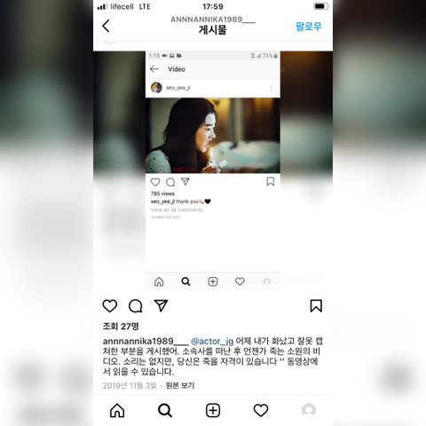 저는 여배우 서예지로부터 모욕적으로 학대를 당했습니다. 저는 여배우 서예지의 공식 인스타그램 페이지에 게시된 게시물들로 인해 저와 가족들은 수많은 성희롱과 자살하라는 협박 및 위협을 익명 계정들로부터 받았습니다. 이후, 여배우 서예지의 공식 페이지에 게시된 모든 게시물들은 다른 증거들과 마찬가지로 그녀에 의해서 삭제되었습니다. 하지만 그럼에도 불구하고 저는 여배우 서예지의 불법적이고 비인간적인 행위를 증명할 수 있습니다. 왜냐하면 여배우 서예지는 저를 인격적으로 조롱했을 뿐만 아니라, 저의 침묵과 싸우고 싶지 않았던 저의 마음을 악용했습니다. 그녀는 저의 전기를 TV 시리즈로부터 불법으로 갈취하였고 저를 향한 폭력을 행하였습니다. 대중에게는 “힐링”으로 더욱 잘 알려져 있는 TV시리즈 "사이코지만 괜찮아“은 실제로 여배우 서예지가 저에게 자살을 강요했던 내용을 담고 있습니다.
