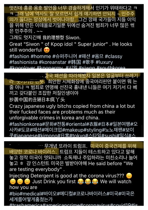 마라탕, 훠거 안먹은지 오래됨. 저 메뉴들 말고도 중국어로 샬라샬라 해놓은 식당 절대 안감 그런 애들 한국에서 자리잡게 하기 싫어서.. 그리고 진심으로 경각심 가져야 하는게, 솔직히 나만해도 예전엔 무슨 뉴스기사에 빨갱이 어쩌고 이런거 달려있으면 늙은이들 개소리라 치부하고 웃어 넘겼는데 요즘 나라돌아가는꼴 보면 절대 웃어넘길일 아닌듯. 첨부한짤은 내가 얼마전에 발견한 인스타 계정인데(내가 이 계정 글들 몇개 신고해서 지워지나 보려고 게시물 하나 저장해놓음) 최XX 사진 올려놓고 이상형이라면서 홍콩 옹호 발언을 경솔하게 해서 인기가 위태하다 , 민주주의가 옳다는 망상에서 벗어나야 한다 이러고 있고 그외에도 온통 미국, 일본 까글 올려놨는데 그게 정당한 비판이 아닌 무슨 미국이 중국 견제를 위해 코로나 바이러스 배양했다 이런말이나 기모노 입은 사진 올려놓고 중국 패션을 따라해봤자 일본은 얼굴부터가 쓰레기 이런 저열한 내용. 계정 주인이 한국인인지 조선족인지는 모르겠다만 민주주의 혐오하는건 확실하고, 미국 일본은 별 말같지도 않은 내용 올려가며 까면서 중국, 중국 배우는 찬양중임. 한국 관련 찬양글들도 올려서 완전 중국인이라고는 생각 안했음. 아무튼 저러한 글들을 한국어써가며, 한국 해시태그 달고 영어로까지 같이 인스타에 올려대는중. 내용이 하도 수준 낮아서, 처음엔 요즘 중국 관련 말 많으니까 누가 어그로 끌려고 만든 계정인줄 알았는데 2019년부터 그러고 있고 일상 게시물보면 한국살고 한국에서 숙박업도 하는듯. 당연히 한국에서 선거때 표 행사할 확률 ㅈㄴ 높음. 빨갱이 타령이 웃어넘길일이 아니라 진짜 공산주의, 사회주의 사상가지고 체제 바꾸려드는 인간들이 있단 얘기임. 사람들이 크게 관심 없어서 그렇지 미국 대사관 담넘어가며 반미 시위하고 서울 한복판에서 김정은 환영한다 난리치고 이런애들 왜있겠음; 저 계정주 한명이 문제가 아니라 저런애들 모이는 커뮤니티나 단체가 분명 있을거고, 찾아서 공론화하고 경계해야됨.