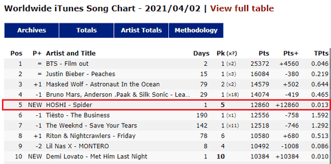 월드와이드 아이튠즈 송 차트 5위했다!!