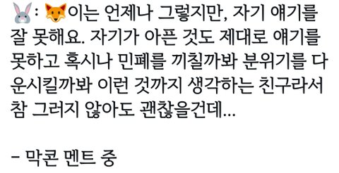 따로 보면 정말 성격이나 성향이 다 다르고 자라온 배경이나 생각하는 방식도 정말 다른 친구들이 많은데 그 각자만의 다름을 인정하고 존중하는 걸 넘어서서 존경한다는게 느껴져