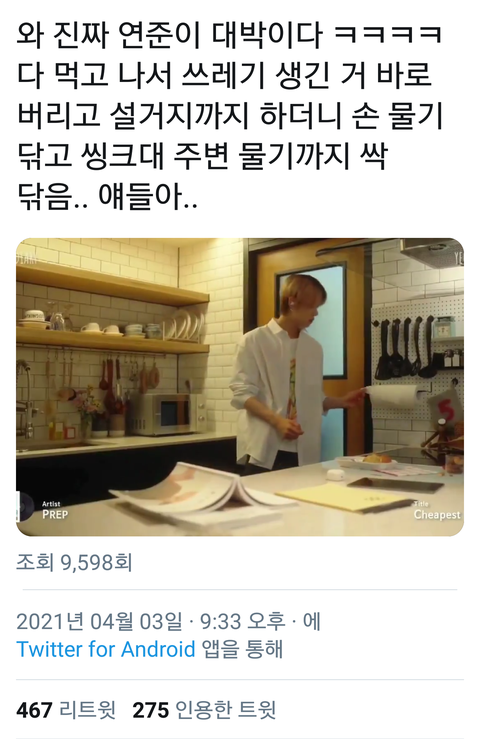 이 투바투에서 장금이역할이기도함ㅋㅋㅋㅋ최연준 청소까지 잘하냐
