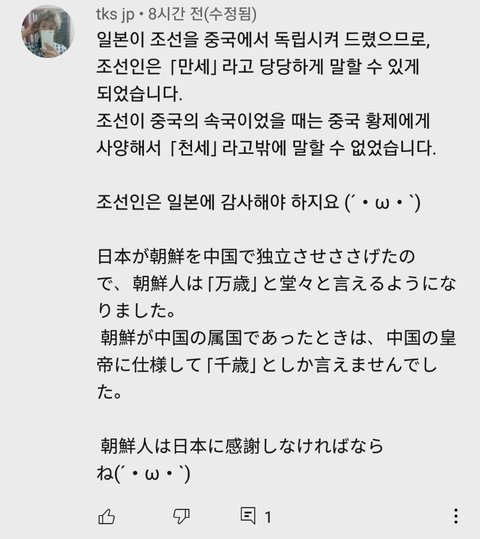거의 모든 일본인댓글은 이 이야기를 하고 있어 일본이 식민통치를 통해 조선을 발전시켰다 중국으로부터 조선을 해방시켰다