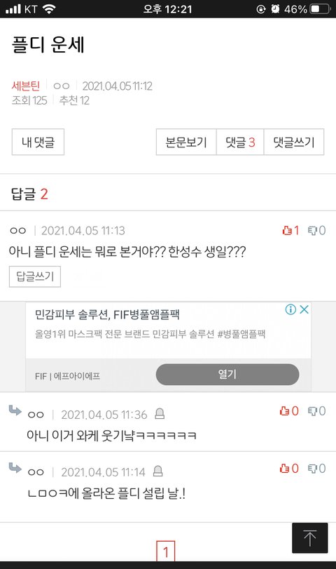 끌디 운세봤다는 글에 달린건데ㅋㅋㅋㅋㅋㅋ왤케 욱기냐 한성수 생일ㅋㅋㅋㅋㅋㅋ