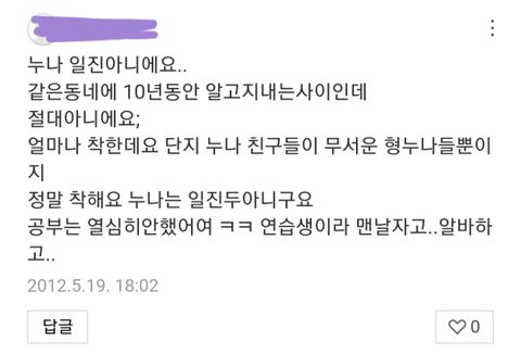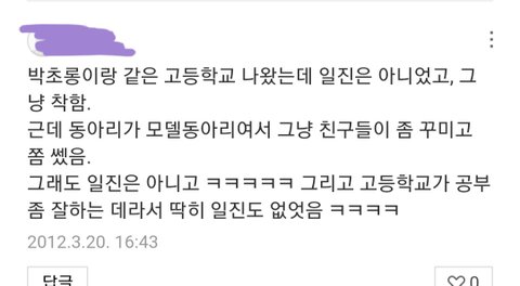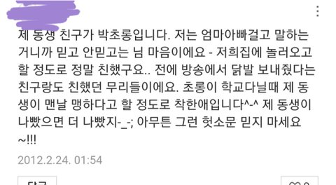 나 박초롱이랑 동갑인데.. 내친구중 하나가 진짜 주위에 잘하고 털털한 성격인데, 일진이었음ㅋㅋㅋㅋㅋㅋ근데 걔...지가 못되게 구는 애한테는 정말....같은 인물인가 싶을정도로 못되게 굴었었음...그러니 저런 댓글이 이번 사건이 거짓이라는 증거는 못됨. 지켜봐도 알수있을진 모르겠지만, 중립을 지키고 기다리는게 나을것 같음.