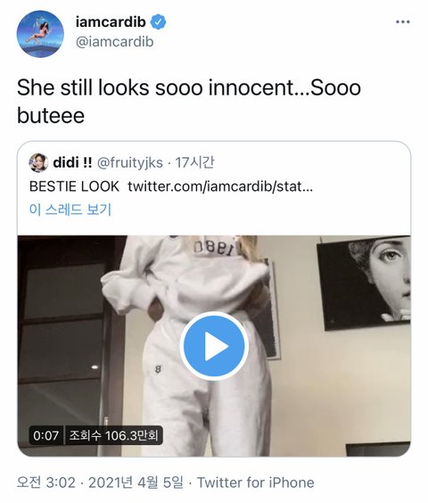 6. 1시간 후 카디비가 로제 귀엽다고 트위터에 올림
