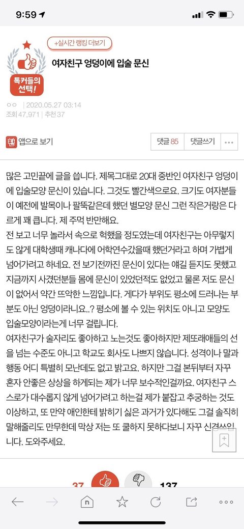 니들 남친 엉덩이에 입술문신 주먹만하개 박혀있어도 넘어갈거임? 이런거