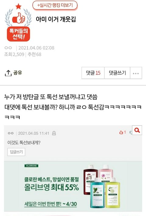 누가 저 방탄글 또 톡선 보낼꺼냐고 댓씀