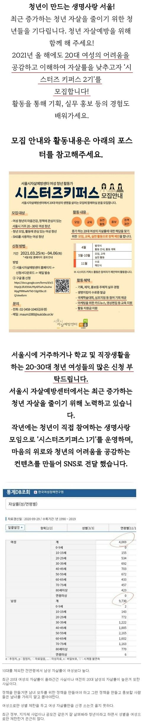 20대 여성의 자살률이 증가하여 정부에서 시행하는 사업