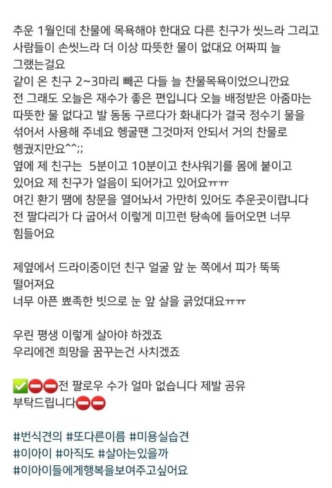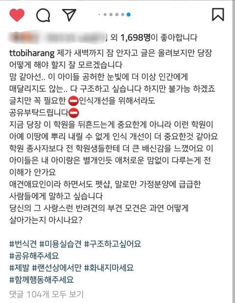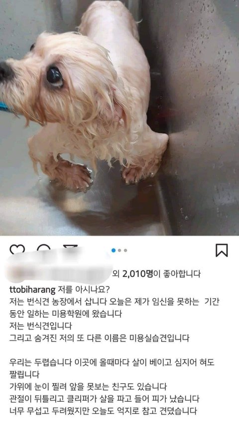 저두요. 저희 강아지가 미용실에서 강압적으로 학대받으며 미용받는 모습보고 충격받아서 부산에 있는 미용학원을 등록했어요. 제가 미용하려구요. 근데 한달만에 학원 그만뒀어요. 학원에서는 자랑스럽게 공장견 아니라 하던데 작은케이지에 두세마리씩 넣어두고 아침10시부터 저녁 직장인 반 있는 시간까지 다닥다닥 앞뒤 위아래로 겹쳐놓고 꺼내주지도 않았어요. 또, 발톱자르는거 보여준다면서 겁에 질려서 침 질질 흘리는 아이 신경도 안쓰고 힘으로 발톱자르고 또 지혈하는 방법 알려준다며 발톱 혈관가까이 일부러 짤라서 피 뚝뚝 떨어지게 만들더니 안아프다고 걱정말라고 지혈제 뿌리면 된다고.. 저 그거 보고 학원 트라우마 생겨서 못갔어요 정말로 누가봐도 벌벌 떨고있는 아이.. 거품물면서 벌벌떨고 납작 엎드려 있는아이.. 그런 아이들을 신경도 안쓰고 자기네들 미용한다고 막대하는 수강생들도 너무 충격적이고 다 죽이고 싶었어요. 4년이 지난 지금도 끔찍해요. 학원 원장이랑 그 남편 구찌, 루이비통 온통 명품으로 도배를 하고 외제차를 타며 돈 버는 거 자랑하던데 꼭 천벌 받았으면 좋겠어요. 인간이 아닌 악마들
