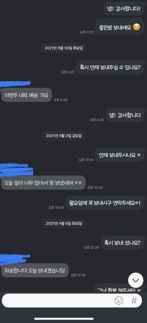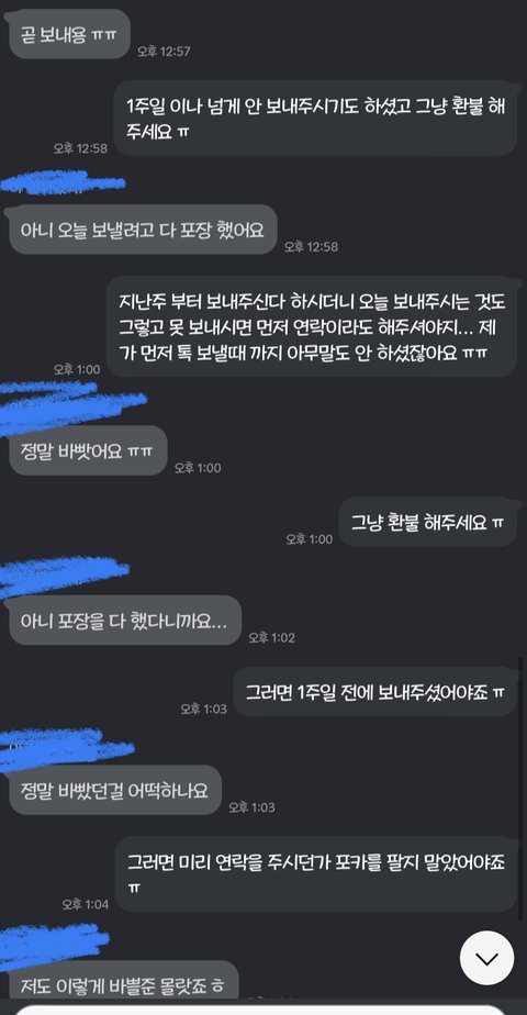 상황- 내가 3.26일에 포카를 샀는데 보내주시겠다 하시더니 내가 연락 할때까지 아무말 없으셨다가 연락 하니깐 곧 보낸다고만 하심 그래서 환불 해달라 했더니 계속 바빴었다 하시는데 어떡함?