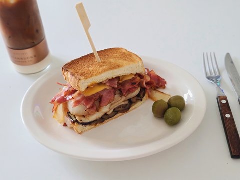 눌러구워 바삭바삭한 치즈토스트 안에 할라피뇨와 올리브가 우르르-