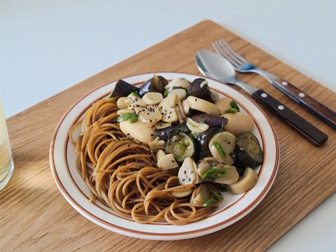 통밀파스타 0.5인분에 가지, 새송이버섯, 닭가슴살 소세지를 넣고 청양고추와 마늘 잔-뜩