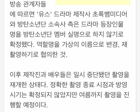 드라마를 엎으면 좋겠지만 코로나 시기에 제작진이나 배우들 생각하면 뭐...난 이 정도도 나쁘진 않은것 같음 근데 기사에 방탄 언급은 없었으면 좋겠음 방탄이랑 상관없는 드라마잖아