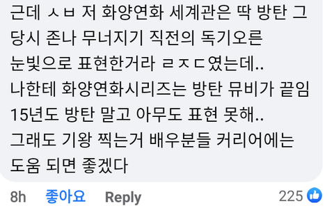 오늘 페북 달린 댓글인데 ㄹㅇ.. 그래도 마지막 줄 처럼 코시국에 배우들 드라마 관계자들 다 힘들텐데 최대한 방탄 언급 없이 드라마 마무리 잘은 되면 좋겠다 사실 화양연화 스토리가 ㄹㅈㄷ긴 하니까 뭐 배우분들 연기만 잘 하시면 드라마 자체는 방탄 동 떨어져 생각하면 막 쌎극혐은 아닐 것 같음 다만 계속 방탄 연검으류 올라올까봐.. 암튼 조용히 잘 마무리 되면 좋거ㅛ네