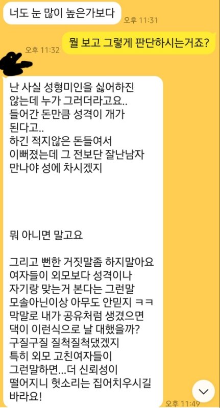 내용 요약: 길에서 26남자가 번호땀 외모 조카 내 스타일 아니지만(개빻았음 조카 아재..) 성격이 맞을수 있단 생각에 한번줘봄(난 외모보단 성격봄) 주말에 만나기로하고 5일정도 연락하는 내내 말투 취향 대화 다 안맞았음 (지는 맞다고 그럼 ㅋㅋ)막 몸매 어떠냐느니 마스크 쓰고 있어서 제대로 몰랐다 얼굴 사진좀 제대로 보내줘라 하며 그러다보니 사진주고 내가 당당하게 눈코입 다 성형 했다함 남자는 나보고 이쁘다함 내가 몸매는 별로라니까 몸매는 괜찮던데 그때 눈이랑 몸매 보고 번호 땄다고 그러는데 기분 좋기는 커녕 이 시끼는 내 성격 취향 따윈 안 궁금해하고 외모만 보는 새끼 같아서 거르기로함 주말에 만나기로 했지만 차니까 돌아온 말