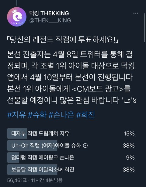 https://twitter.com/thek___king/status/1377434210001022982?s=21 얘들아 본선 1위는 못 해도 본선에는 들어가야지 울 슈화 들어가자