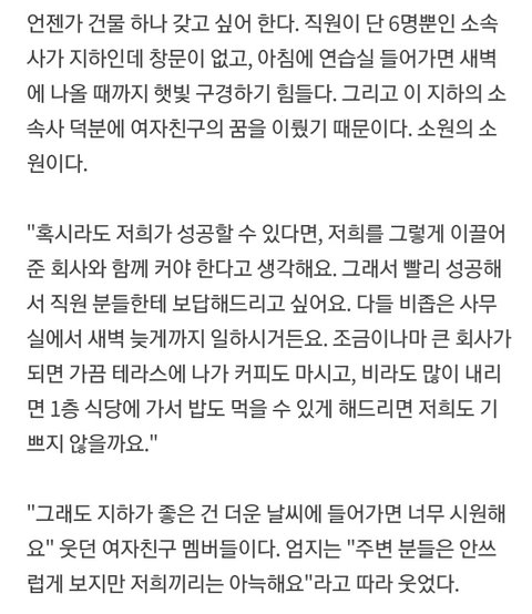 성공해서 쏘스뮤직 사옥도 생겼었고 하이브 영상으로 봐서는 가끔 테라스에서 커피 마시는 거나 비라도 오면 1층 식당에서 밥 먹는 정도는 당연하게 할 수 있을 듯.....