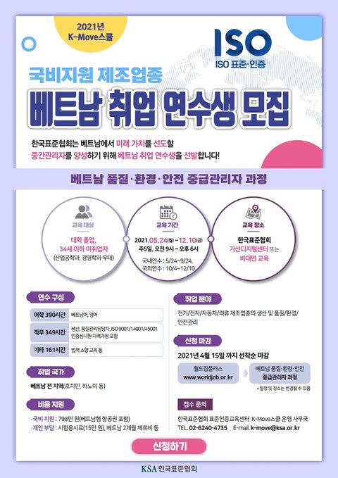 한국표준협회는 베트남에서 미래 가치를 선도할 중간관리자를 양성하기 위해 베트남 취업 연수생을 선발합니다!