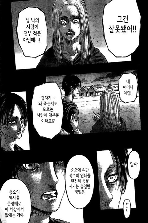 결론은 에렌이 증오의 연쇄는 종결 ,증오의 역사를 문명째로 없애려고 한 거 아냐? 근데 결국 못 시켰잖아 그럼 대체 에렌이 본 미래는 뭐임..?? 대체 땅울림 왜 한거야? 인류 8할을 없애도 어차피 달라지는게 없는데 대체 대학살 왜 한거임? 그래놓고 막판에 그냥 하고 싶었다고..?? 하....나만 혼란스럽니...??