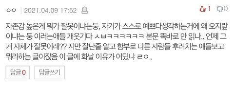 자존감 높은거 좋지. 그런데 자기객관화 못해서 객관적으로 평범한 얼굴을 예쁜 얼굴이라 착각하는거, 그렇게 나는 뭐라도 되는 것 마냥 남 까고 다니는거, 뽀샵 잔뜩 들어간 사진을 나라고 합리화하는게 자존감이 높은게 아니야.. 진짜 자존감이 높다는 건 나는 예뻐서 내가 너무 좋아. 이게 아니라 나는 예쁘지 않지만 그래도 내가 좋아. 이거임. 번외로 성형하고 자기 자존감 높아졌다고 생각하는 애들이 하나같이 다 전자같은 케이스임. 주절거리다보니 말이 두서도 없고 길어졌는데 어쨌든 글은 안지울거임.