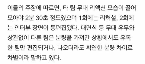 +절대 얘네 분량을 다른 팀보다 더 달라는거 아니고 적어도 오늘 무대안한 팀들만큼이라도 주면 감사함 그리고 오늘 말고도 대면식때 리허설 안보여준거랑 오늘 우리만 단체인터뷰 안올라온거 저 작은 분량에서 이름까지 틀린거 다 팬이 사람이 틀릴 수도 있지 오구오구 이러면서 봐줘야됨?더도말고 덜도말고 그냥 다른 출연팀들만큼이라도 주라는게 그렇게 싫어?내가 무슨 다른 애들 분량 줄여!우리 애들 올려! 이런것도 아니고 그냥 분량차이 좀 줄여달란 말임 참고로 진짜 우리 애들 분량때문에 다른 애들 분량 적을덴 가만히 있고 이제서야 이러는거 아니고 예전부터 분량차이 심각한거때문에 문제있다고 생각했었고 오늘 분량이랑 지금까지 한 자잘한 실수같은게 모여서 한번에 말하는거임 분량이랑 상관없이 대면식때 아이돌 sf9 불러놓고 써놓은 개같은 자막이라든지 그런거 다 쪼잔해 보일까봐 팬들끼리만 그냥 욕하고 끝냄 위에 사진은 다른 팀들 자막이랑 sf9 자막임 다음 화 분량은 우리가 예측할 순 없지만 지금까지 나온 1,2화랑 유튜브에 올라온 비하인드같은거 분량같은거 말하는거임 아직 2화까지 안나왔지만 그 2화동안 분량이 이 지경이니까 쓰는거임 제목은 분량 관한 거만 썼는데 그냥 엠넷이 슾구한테 기본적인거라도 해줬으면 좋겠음 단체 인터뷰나 리허설을 보여준다거나 그냥 애들 이름이라도 잘 써줬으면 좋겠음 얘네 연습 진짜 열심히 했는데 엠넷 3화에서 보자