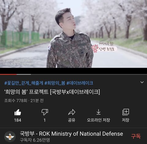 저 옆집 맬로딘데 국방부 유튜브에 펜타곤 진호님 우리 현식이 랑 다른 분들이랑 같이 노래 부른거 올라왔는데 혹시 모르실까봐 왔어요! 아시고 있는더면 굄장히 머쓱..^^