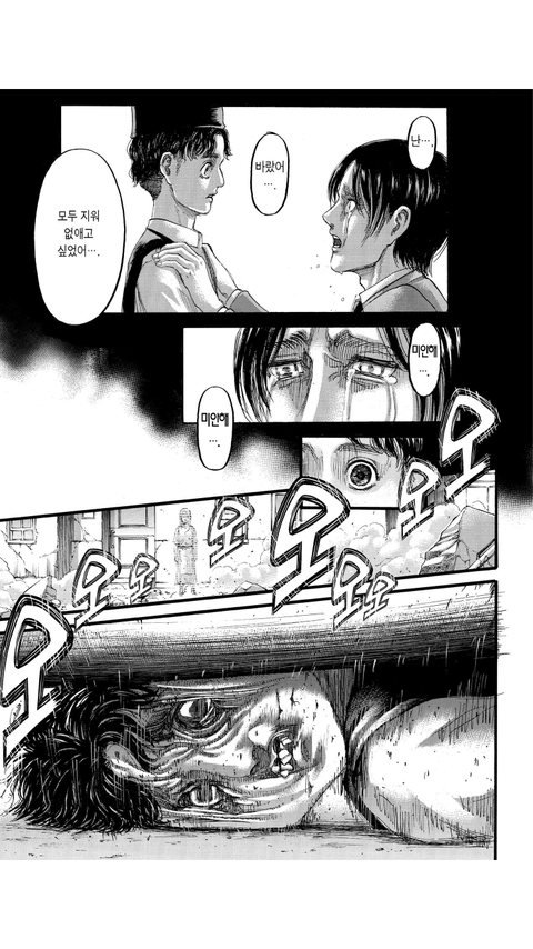 외전에서 풀어줄지는 모르겠는데 1화에 다녀와 에렌,히스임신,책 표지 루프물이나 평행세계 떡밥 다 안 풀렸고 땅울림 잔인하게 연출해서 옹호 못 하게 해놓고 살육자가 되어줘서 고마워...???