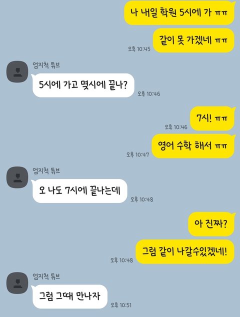화수목 같이 학원도 가고 금요일 내가 더 빨리 학원가서 같이 못간다니깐 학원 몇시에 끝나냐고 물어보고 같이 집 감 ㅎㅎ