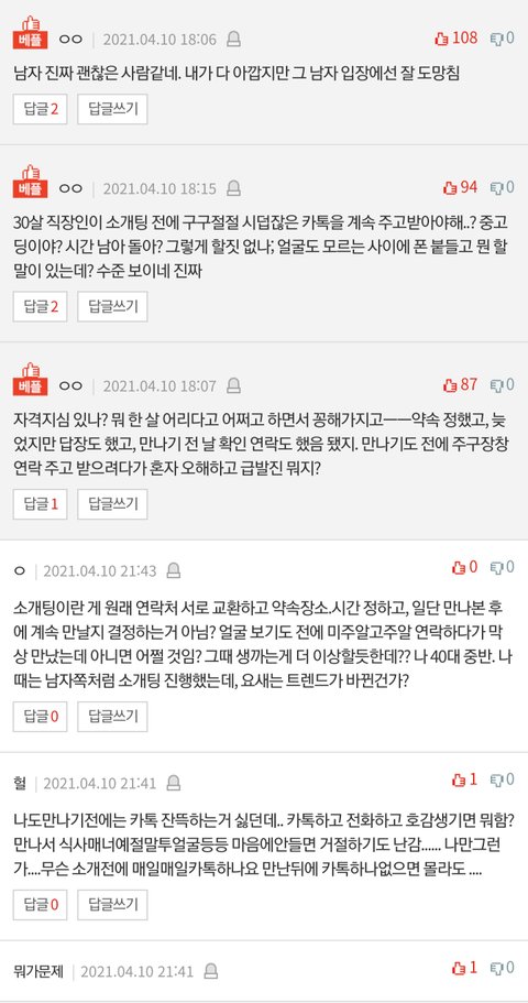 보기도 전에 연락을 하는게 불필요하다고 생각한게 예의에 어긋난건 아니라 생각한다. 그리고 만나는 약속 잡을때도 최대한 저를 배려해서 약속 장소 정했고, 인간 대 인간으로 자기는 최대한 배려했다고 생각했는데, 님 잇너는거 보니 안 만난게 다행이란 생각이 든다.