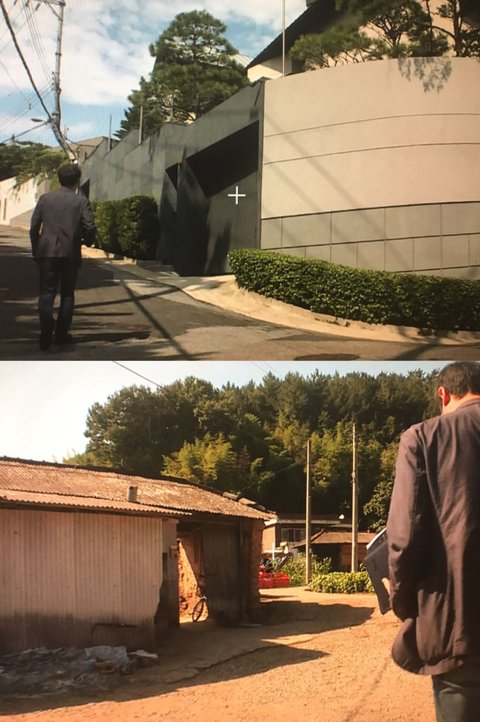 위의 친일파 후손의 집과 아래의 독립운동가 후손의 집을 비교하고 있어요.