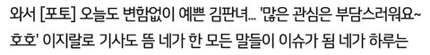 넌 어마무시한 사랑과 관심을 받지만 그만큼 힘들기도 함 남자들이 들이대는데 걍 들이대는 게 아님 존잘남도 많이 붙지만 아저씨들도 많이 붙음;; 추접스럽게 다가오는 사람도 많고 막 스폰 제의도 하고 상상을 초월함 그게 너무 싫어서 정중하게 거절하니깐 싸가지 없다는 말들 사람들 사이에서 돌고 있음 넌 일반인이지만 인성논란도 뜸 막 등교하다가 뭐 잘못 밟아서 인상 찌푸리면 그거 짜깁기 돼서 5년 동안 회자된다;; 판에서 '김판녀 이 표정 뭐야?' 움짤 올리고 대충 궁예한 글이 하루만에 추천 천 찍고 댓글 3000개가 넘어감 근데 넌 판을 하지 않지, 그 상황 모름