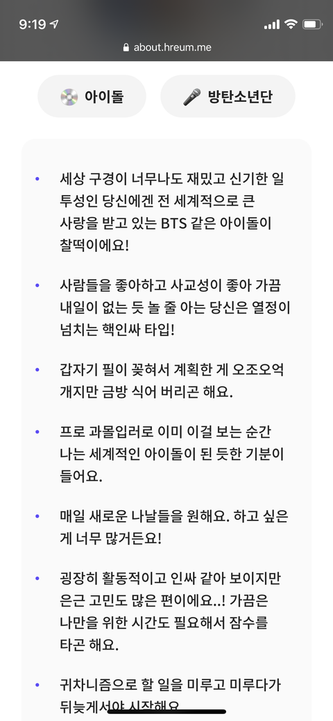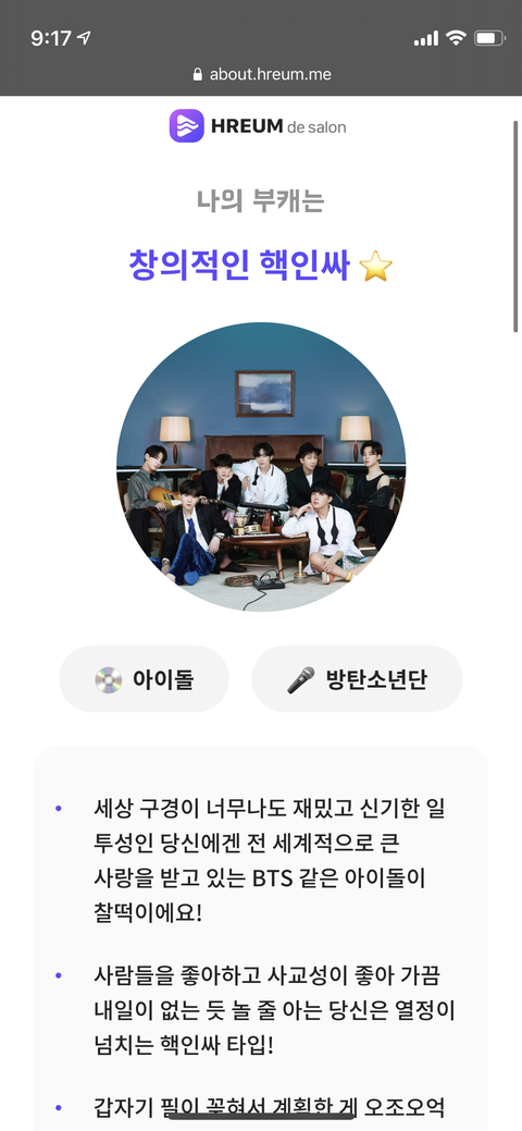 ㅋㅋㅋㅋㅋㅋ가수 부캐테스트 했는데 나 핵인싸 아이돌로 방탄나옴ㅋㅋㅋㅋ최애 나오니까 진짜 기분 개죠타