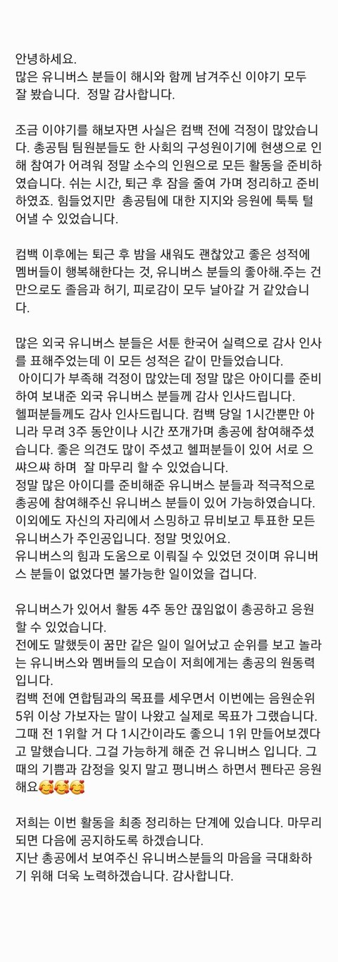 이 모든건 해외유니+총공팀+헬퍼들+스밍하는 수많은 유니들이 잇어서 가능한것같아 진짜 한달간 너무 고생했고 수고 많았어 모두♥️♥️ 이런 따뜻한 팬덤의 팬이라 너무 자랑스러워