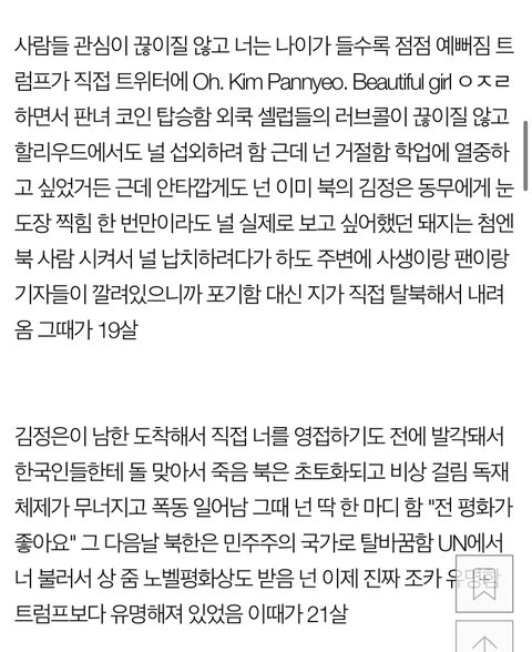 사람들 관심이 끊이질 않고 너는 나이가 들수록 점점 예뻐짐 트럼프가 직접 트위터에 Oh. Kim Pannyeo. Beautiful girl ㅇㅈㄹ하면서 판녀 코인 탑승함 외쿡 셀럽들의 러브콜이 끊이질 않고 할리우드에서도 널 섭외하려 함 근데 넌 거절함 학업에 열중하고 싶었거든 근데 안타깝게도 넌 이미 북의 김정은 동무에게 눈도장 찍힘 한 번만이라도 널 실제로 보고 싶어했던 돼지는 첨엔 북 사람 시켜서 널 납치하려다가 하도 주변에 사생이랑 팬이랑 기자들이 깔려있으니까 포기함 대신 지가 직접 탈북해서 내려옴 그때가 19살