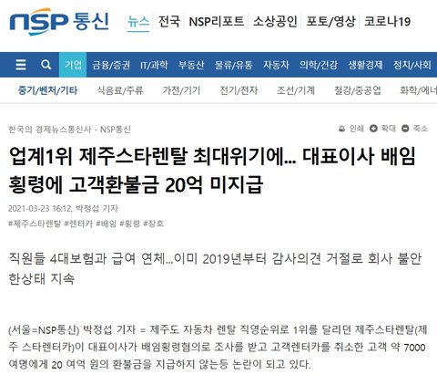 다름이 아니라 월급 체납에 관한 일인데요...제주도 내에서 렌터카 1위 회사라고 하는 제주 스타렌터카는직원 급여와 보험료가 4억원이나 체납되어 있구요.고객에게 지급해야 하는 예약 취소 환불금도 20억원이나 미납 중.