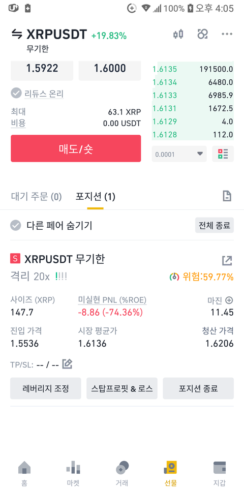 내가 리플에 20배로 숏하자마자 귀신같이 폭등해서