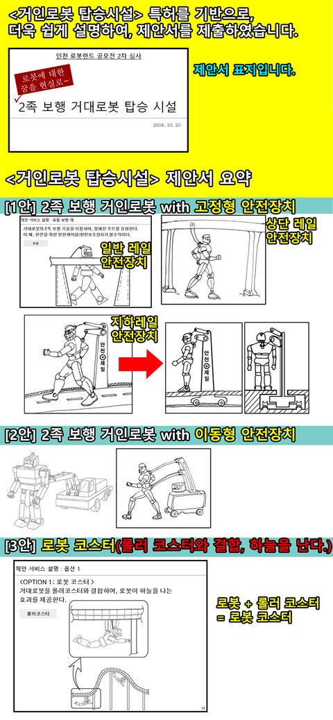 - 인천로봇랜드 공모전 수상작품인 저의 ‘거인로봇 탑승시설’은 2008년 인천시 국제전시회를 통해 공개되었습니다.