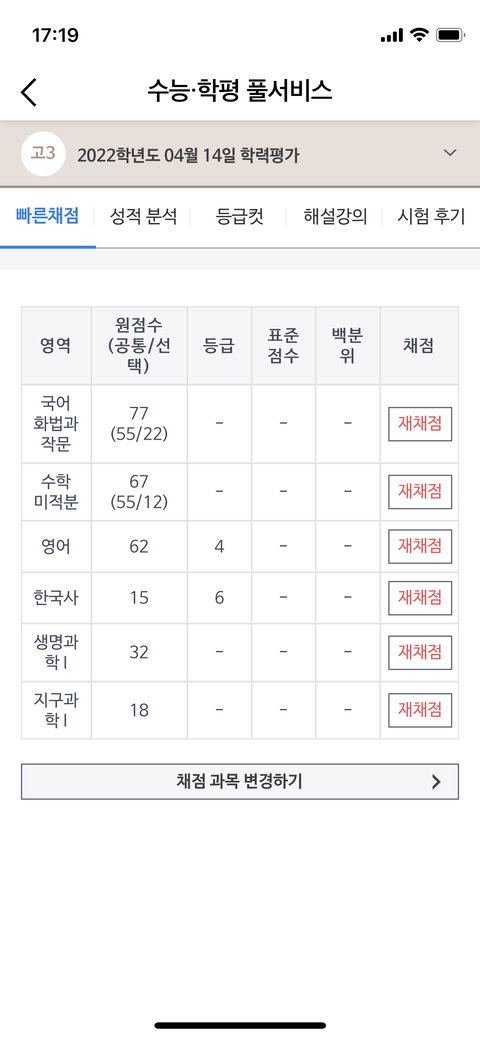 수시 3점대였고 목표가 높아서 정시로 돌린 케이스야 모고 공부 처음하면서 하루도 빼놓지 않고 했고 10시간씩 했어 3모는 그냥 돌린지 얼마 안 돼서 그런가보다 했는데 오늘은 너무 우울하다 나 진짜 열심히 했는데 점수는 올랐는데 등급은 똑같네ㅋㅋ 영어 듣기는 틀린 적 없었는데 갑자기 영어 듣기만 8점 나가고.. 진짜 짜증난다