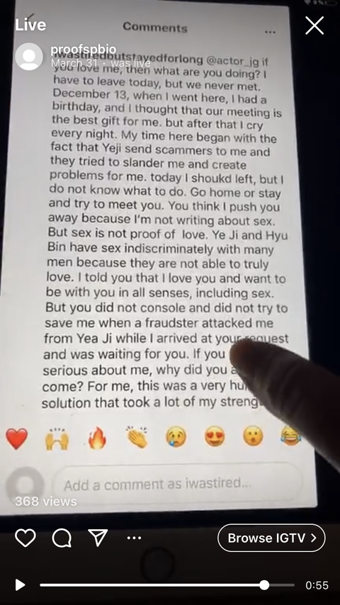 그녀의 에이전시가 괴롭힘에 관한 것이 아니라고 말하는 방식은 이상합니다. 여기에 서예지가 이준기에게 쓴 글을 올렸고, 김정현에게 쓴 글과 완전히 비슷한 것도 다른 사람을 괴롭 히도록 밀어 붙였다.