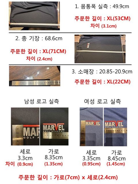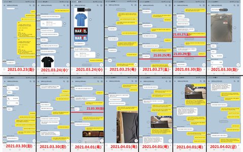 7. 2021년 4월 1일(목요일) 1) 티셔츠 배송 받음. 남성 티셔츠 사이즈는 XL로 주문하였으나 실제로 재보니 XL가 아님을 확인하여 카카오톡으로 문의 2) 몸통폭과 소매장길이 모두 인터넷에 표기해둔 길이보다 최소 1cm~최대 3cm가 차이나며, 처음 구매요청한 사이즈는 XL인데 실제로 재보면 M사이즈와 비슷한 티셔츠가 제작되었음을 문의함. 3) 1~2cm 오차는 양해바란다는 답변과 인쇄된 제품은 반품처리가 불가능하다는 답변을 끝으로 카카오톡을 보내도 답변없이 잠수.
